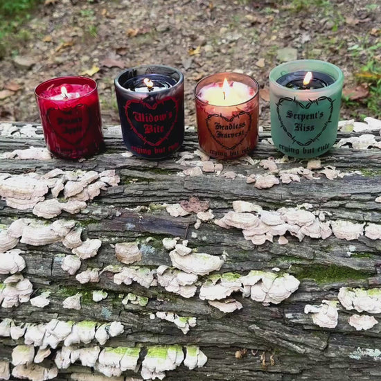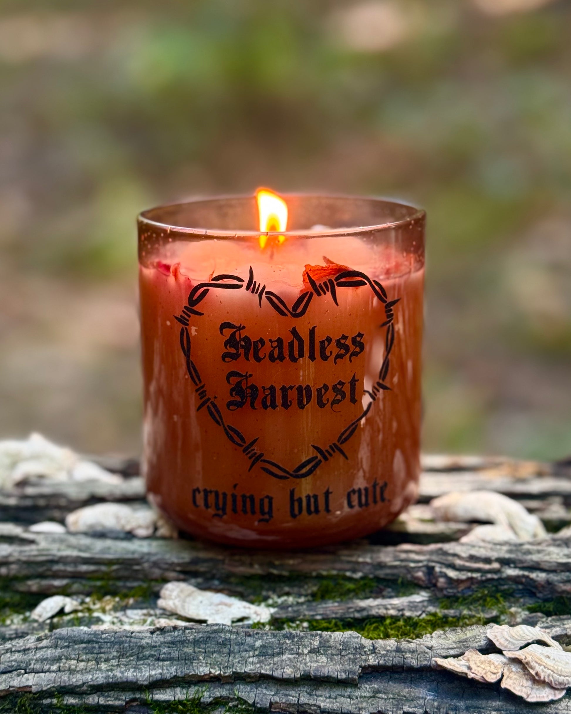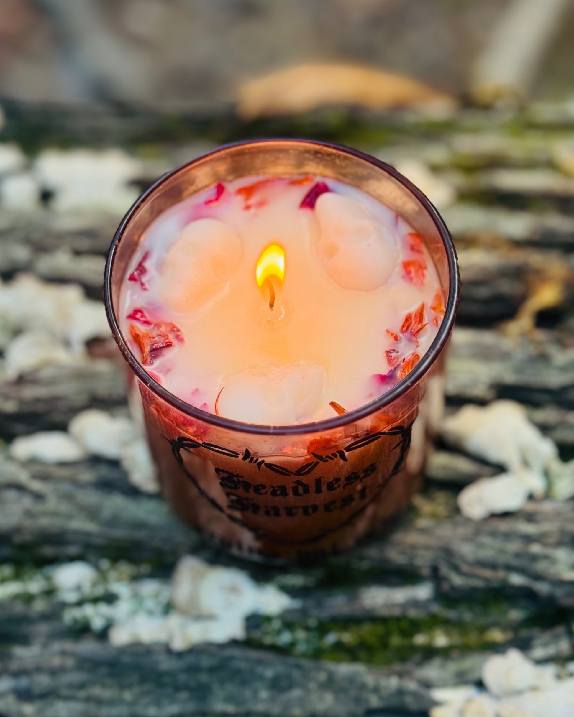 A hauntingly sweet tribute to fall’s favorite season. Headless Harvest is hand-poured with a custom black shimmer vinyl label, white coconut apricot waxinto a warm 8.5 oz amber glass tumbler, crowned with dried red roses, dried lilies, and eerie wax skull molds for a finish that feels straight out of a gothic fairytale.